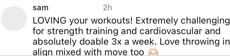 Most MOVE workouts are 30–40 minutes, making them easy to fit into a busy schedule. You can follow the program 2–4 times per week, move at your own pace, and adjust as needed based on your energy and recovery.