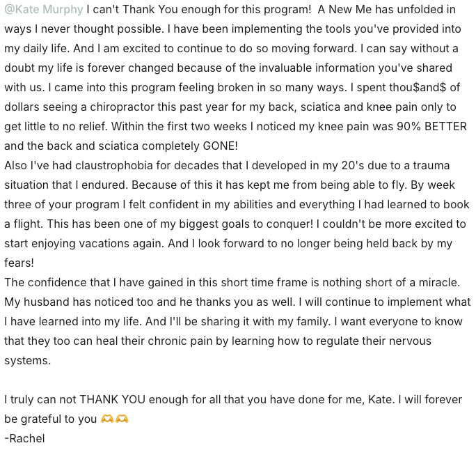 For the past 1.5 years, I’ve been training and testing A.I. Kate by feeding it my latest research, science-backed insights, blog posts, writings, personal notes, client questions, and therapeutic frameworks. The goal? To create a trusted companion that reflects the way I think, speak, and support others—so you can get answers and guidance that feel as close to talking with the real me as possible. I made A.I. Kate to serve this community—because while I genuinely want to help everyone, I’ve often felt there just aren’t enough hours in the day to answer every question. Now, you can bring your curiosity, struggles, and breakthroughs to KateAI anytime—and receive grounded, empowering support rooted in nervous system healing, mind-body connection, and the principles I live and work by.